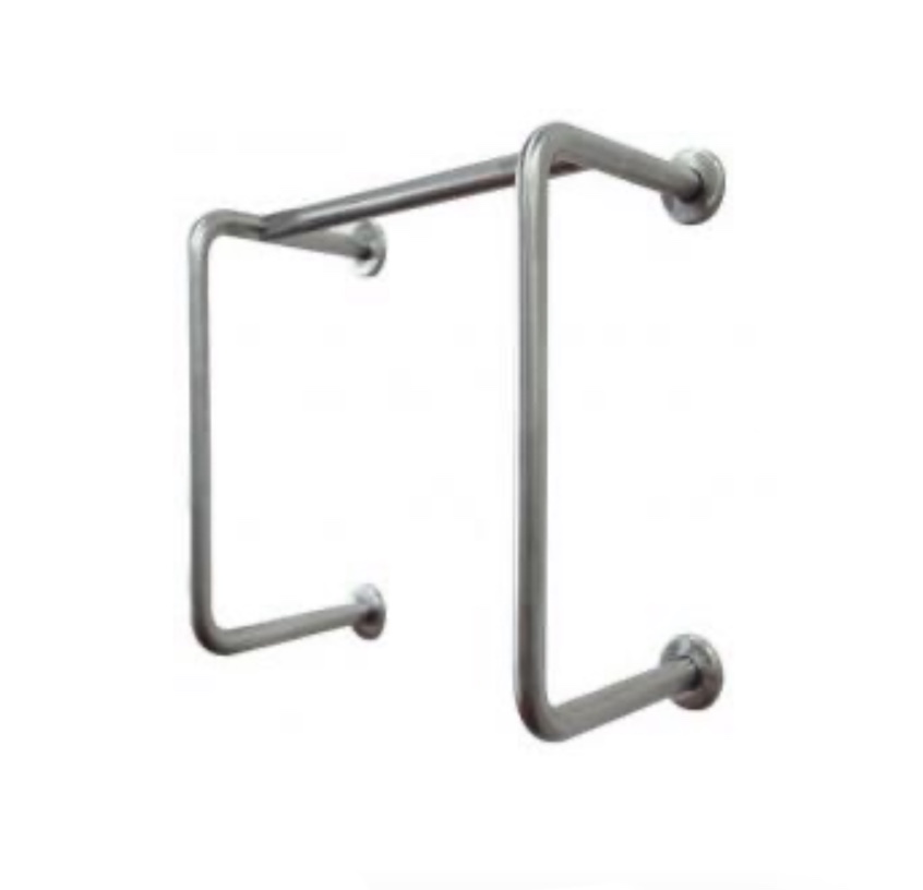 Barra para minusválidos para mingitorio a 90° de 0.50x0.50m fabricada en tubo redondo de 1- 1/2 In con codos en extremos y 4 chapetas decorativas para anclaje a pared. Precio no incluye instalación.